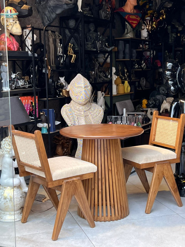 ميزناهارخورى دونفره تمام چوب قطر ٧٥ سانت بهمراه دوعدد صندلى چوب حصير